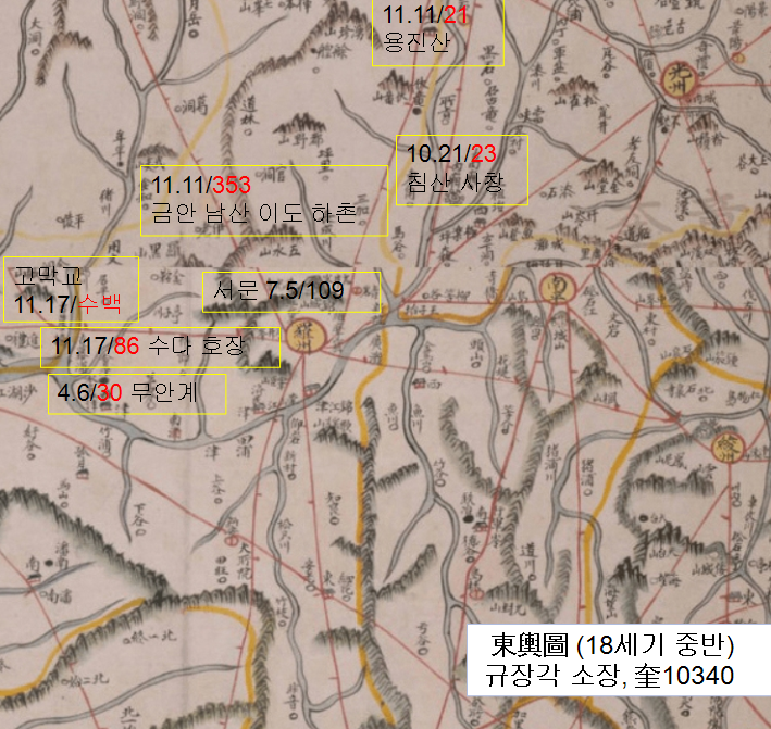 1894년 4월 무안 함평 영광 등 전라도 서남부 귄역 동학농민전쟁 일지도 (기본도 : 대동여지도, 규장각 소장)