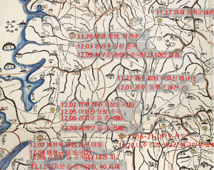1894년 11월~12월 무안 함평 영광 등 전라도 서남부 권역 동학농민전쟁 일지도 (기본도 : 대동여지도)