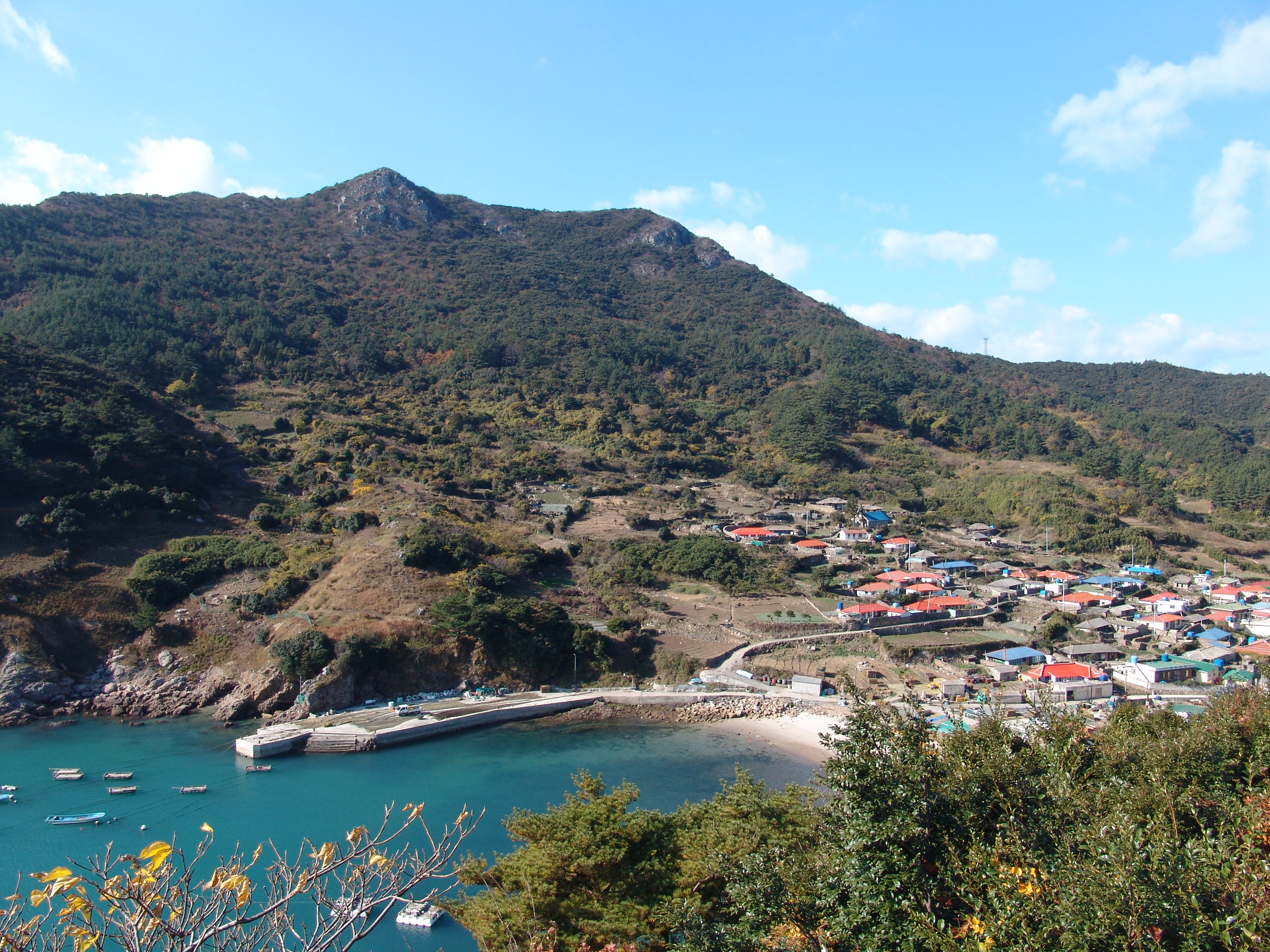 신안 흑산면 사리마을 전경(마을 뒤쪽 초가집이 정약전이 열었던 서당을 복원한 사촌서실[복성재]이다.)(2006.11.30)
