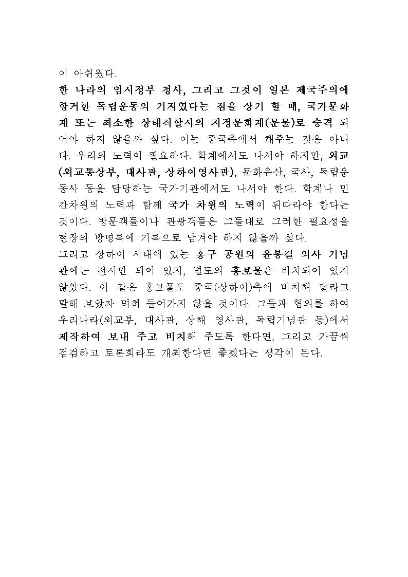 한 나라의 임시정부 청사, 그리고 그것이 일본 제국주의에 항거한 독립운동의 기지였다는 점을 상기 할 때, 최소한 상해직할시의 지정문화재(문물)는 되어야 하지 않을까 싶다. 이는 중국측에서 해주는 것은 아니다. 우리의 노력이 필요하다. 학계에서도 나서야 하지만, 문화재를 담당하는 국가기관에서도 나서야 하고, 외교적인 노력과 함께 국가 차원의 노력이 뒤따라야 한다. 방문객들이나 관광객들은 그들대로 그러한 필요성을 현장의 방명록에 기록으로 남겨야 하지 않을까 싶다.