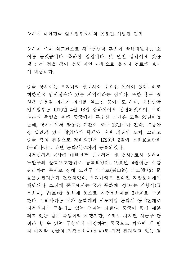 그때 제안 내용은, 대한민국 임시정부 청사가 중국 문화재(문물보호단위, 우리나라의 기념물에 해당)로 지정되어 있는데, 우리로 치자면 시군 문화재에 해당되는 구급(區級) 문물보호단위이니, 국가적으로 노력을 기울여 성급(省級, 또는 직할시급) 문물보호단위로 승격을 하는데 나서 달라는 것이었다.
